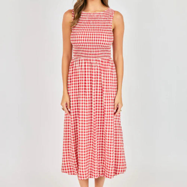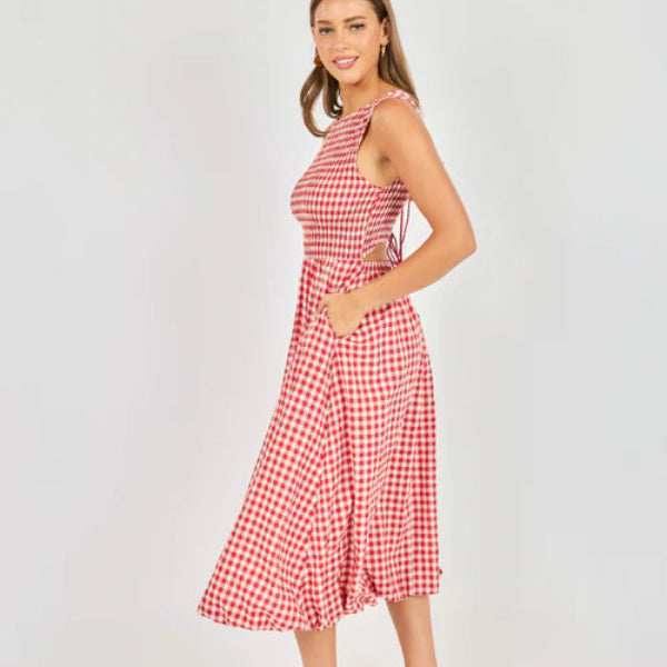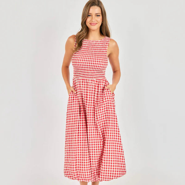 This gingham midi is made from crisp cotton with a fully smocked bodice that stretches to fit, creating an effortlessly flattering shape through the waist and back. The bubble skirt adds charm and volume, while hidden pockets make it feel just as practical as it is pretty. Overall? A joyful piece that's lightweight and easy to wear from morning errands to sunset dinners.