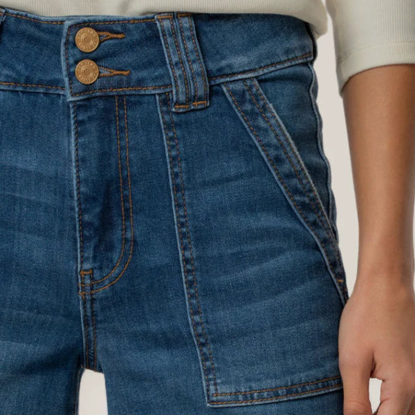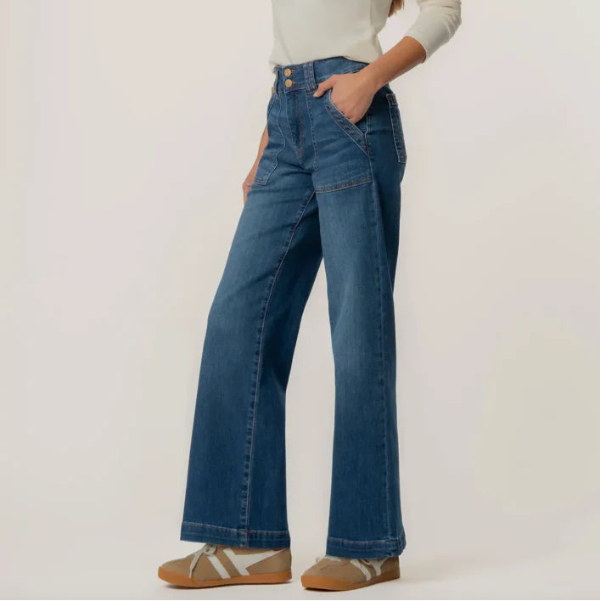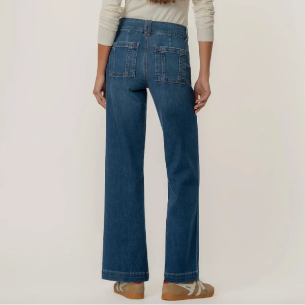 Upgrade your denim with these high-rise wide leg jeans in a classic medium wash, designed for both style and comfort. Featuring porkchop pockets, a wide waistband with double buttons, and double belt loops, they offer a structured, flattering fit.