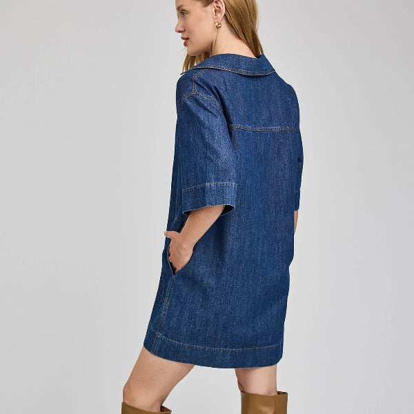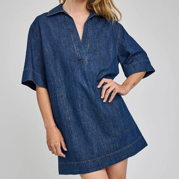 The Evelina dress is made of a denim fabric that has been specially washed for a perfectly lived-in look. Features include a collar with a v-neckline and side seam pockets.