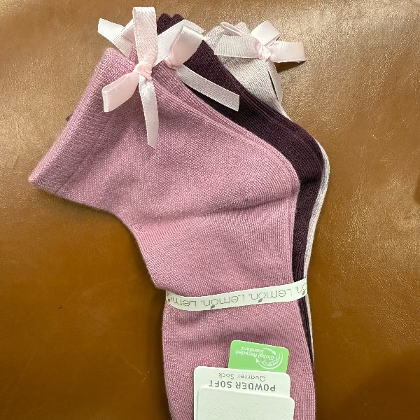 Bring a little sweetness to your step with our Powder Girly Quarter Crew Sock 3-Pack. Made with 65% recycled polyester, these non-terry socks are soft, lightweight, and designed for everyday charm. Featuring a ribbon bow accent at the cuff, adding a playful, girly touch to your sock drawer. Perfect for pairing with sneakers or peeking out from ankle boots, this trio adds sweetness to every outfit.