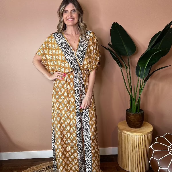 Satin tunic with V neckline and wide short sleeves. Adjustable waist with fabric ribbon. Front slit on hem. Inner snap button on neckline for closure
