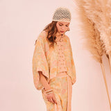 Short-sleeved Japanese blouse finished with ribbon trim. Cropped length, reaching to the waist. Floral print with butterflies. V-neckline trimmed with ribbon and embroidered stones.