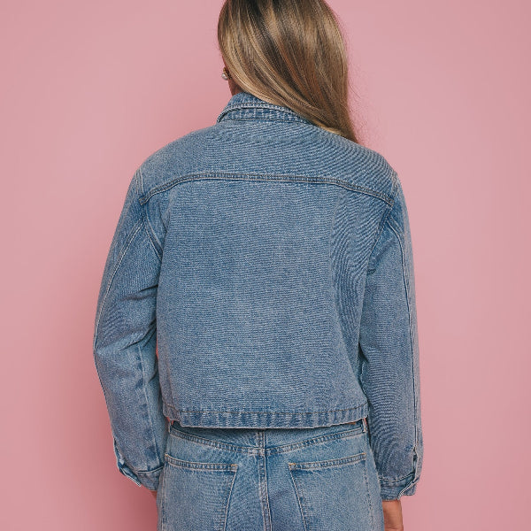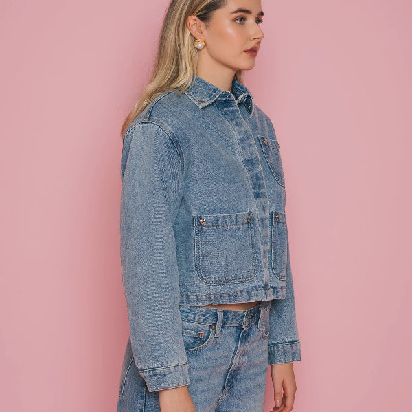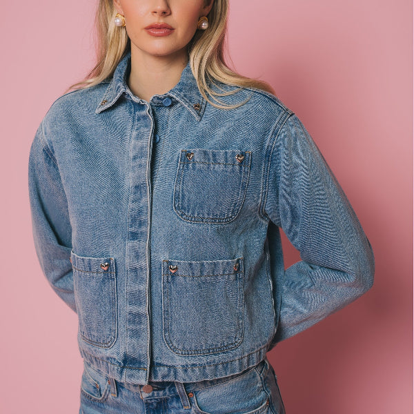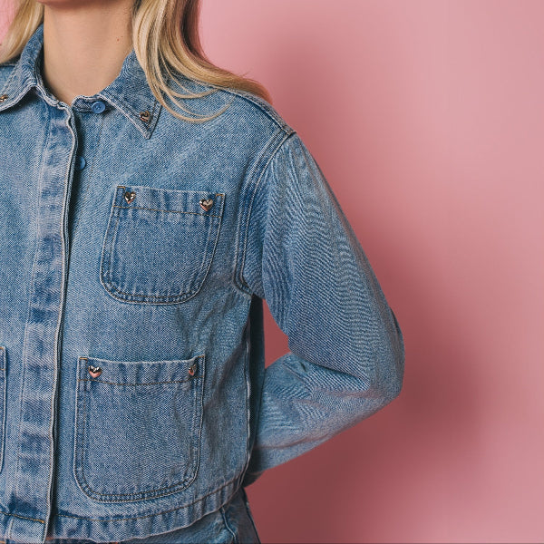 Our Magali Jacket returns in the perfect blue denim, updated with chrome heart hardware placed at the corners of the front pockets. This version features a self-fabric collar (no contrast here), a quilted lining for warmth, and a hidden front placket so the buttons stay clean and understated.