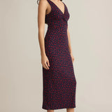 This sleeveless ditsy midi dress, made with midweight rayon fabric, features a twist detail at the front and a deep v-neck. Designed with adjustable straps and a back slit, it has a clean finish and a flattering, feminine fit.