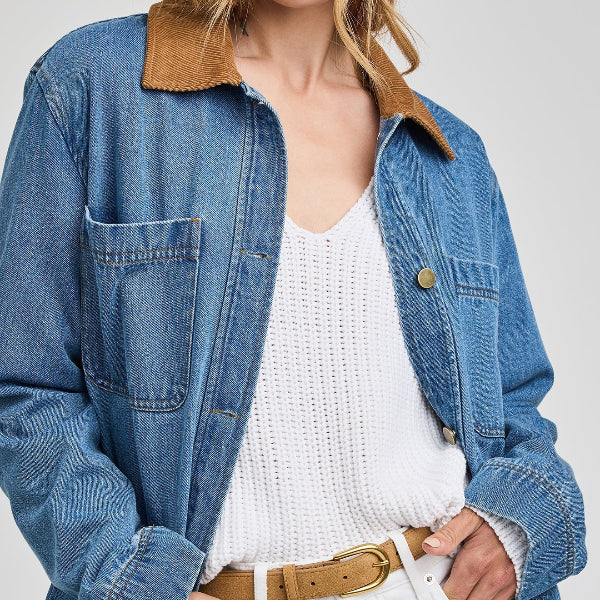 The Flynn jacket is made of a heavy weight denim fabric that has been specially washed for a perfectly lived-in look. The effortless silhouette features patch pockets and a contrast corduroy collar.