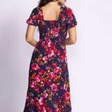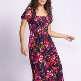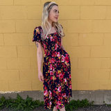The Francesca Dress features a dreamy floral print with cinched sleeves, a ruched bodice for a flattering stretch-to-fit look, and a flowy skirt. Lightweight and versatile, it's perfect for travel-ready style. Midi Length.