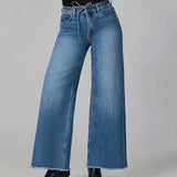 DIVINE BLUE: Make a statement with MILAN. These ultra high-rise jeans feature an exaggerated wide leg and dramatic drape, crafted for movement and modern edge. The Milan features a medium blue wash with a raw edge hem and a denim belt for a feminine touch.