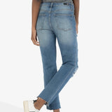 - Raw edges and threadbare rips provide a perfectly lived-in look to these high-rise mom jeans with slimming Fab Ab front pockets to update the fit.