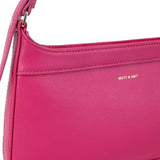 Slim shoulder bag with a top zipper closure and an adjustable buckle strap.
