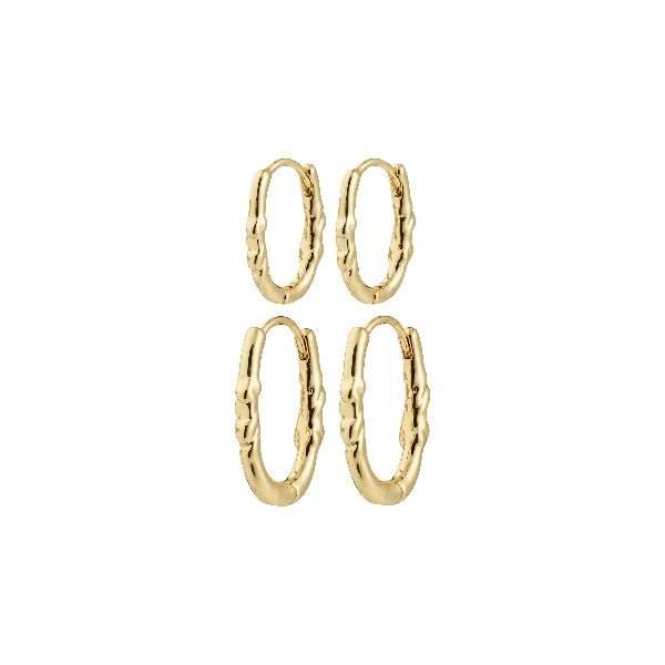 SENSE the flow, double the impact! The gold-plated SENSE hoops from Pilgrim offer you a 2-in-1 set of oval hoops with an organic shaped design, creating a perfect mix of texture and shine. Designed with easy-to-use snap locks, they are a must-have in your jewellery collection – perfect for both solo wear and stacked styling. Wear the small hoops alone for a minimalist look, or mix with the larger ones for a stacked expression. Style the earrings with a chunky knit and soft waves for an effortless, fashion-forward feel. Made from 99% recycled materials – mindful of our shared planet.