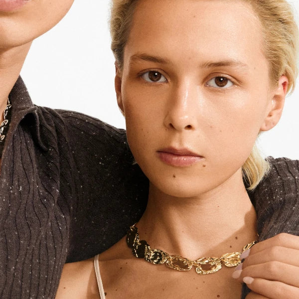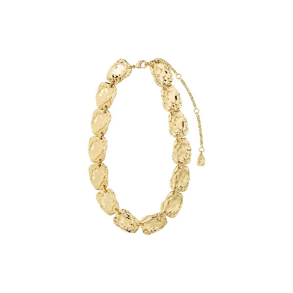 SHIFT your glow, make it iconic! The gold-plated SHIFT necklace from Pilgrim is a true statement piece. The flat coins have a raw, rustic surface that combines power vibes with a relaxed, stylish attitude. An eye-catching fashion item that drapes beautifully around the neck and works perfectly for both glam nights and casual layering. Style it with a flowy dress and chunky boots for the perfect mix of bohemian and urban edge. The necklace measures 38 cm + 12 cm extension chain and is made from 99% recycled material – fashion with care!
