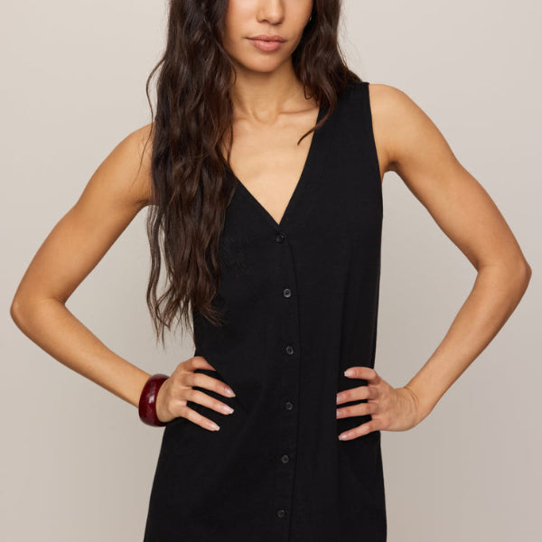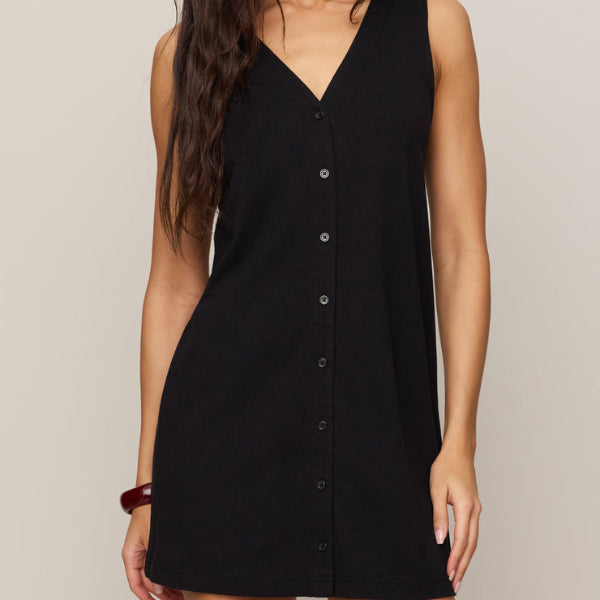 This mini dress is designed with a 100% cotton fabric, button front, and a flattering v-neck. It’s a versatile dress you’ll love to dress up or down day to day.