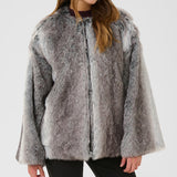 Faux fur jacket features a plush, textured finish and a straight silhouette. Designed with a round neckline and long sleeves for an elevated, modern look.