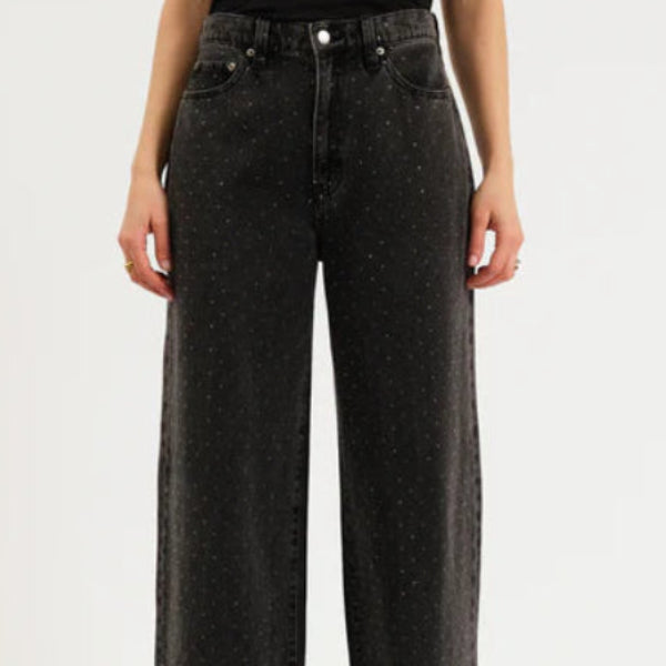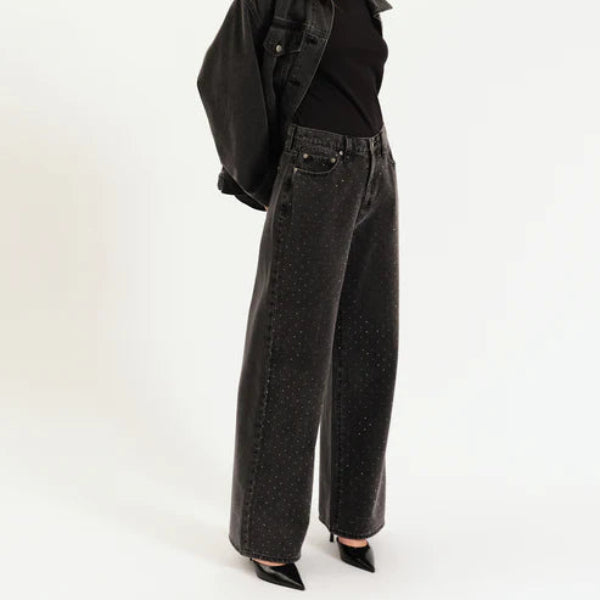 These mid-rise palazzo jeans bring party-ready sparkle to your everyday wardrobe with festive studs scattered throughout the relaxed, wide-leg silhouette. In classic black with just enough shimmer, they're the perfect balance of comfortable and eye-catching—because who says you can't sparkle on a Tuesday?