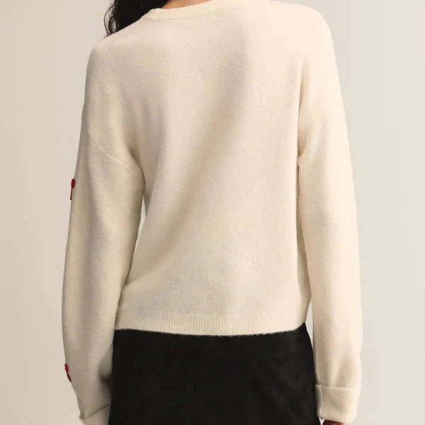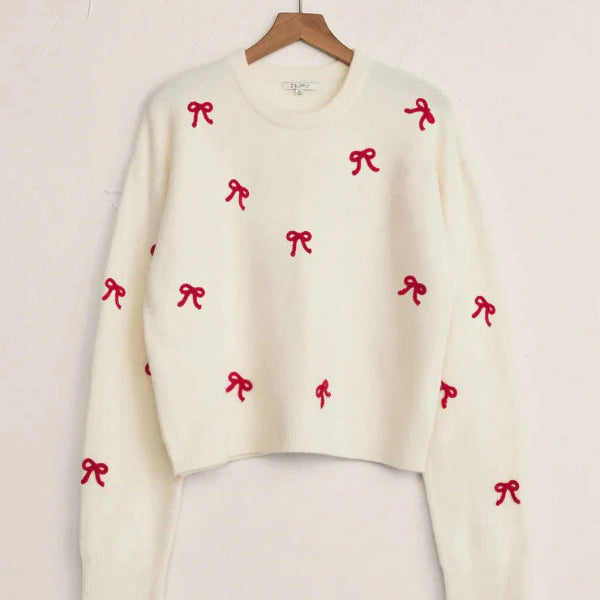 Playful yet cozy, this crewneck sweater is finished with delicate bow embroidery across soft yarns. Its relaxed fit makes it the perfect festive layering piece.