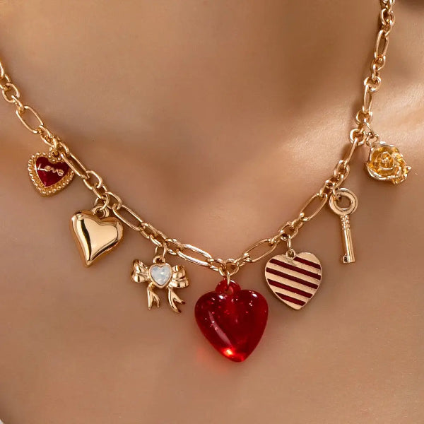 Charm Necklace a delightful mix of charms, including a bow, Stripe, key, flower and Heart charms, all beautifully strung on a sleek chain. The checker pattern brings a trendy, bold vibe, the heart represents love, and the acrylic red heart charm adds a bit of glamour and shine.