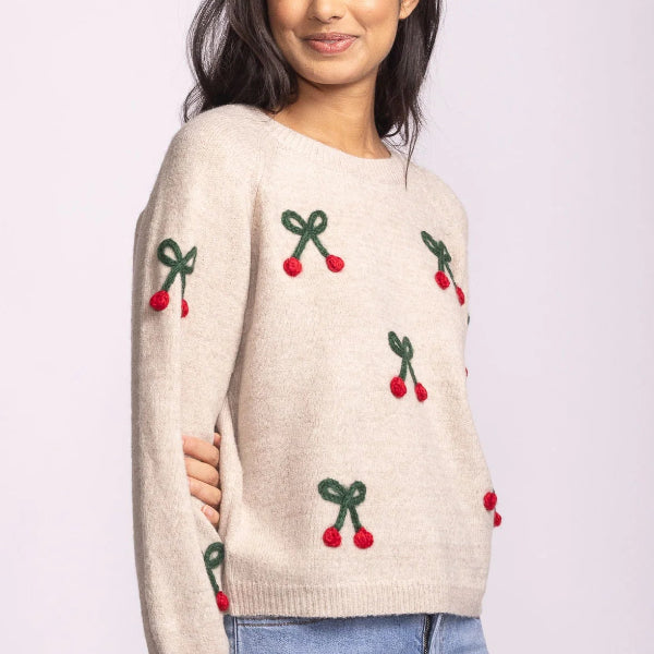 The Mon Cherry Sweater is a cozy knit sweater with cherry appliques. Designed with a relaxed fit, raglan sleeves, and a round neckline, it's made for both comfort and effortless style. Style it with jeans or a skirt for a cute everyday look.