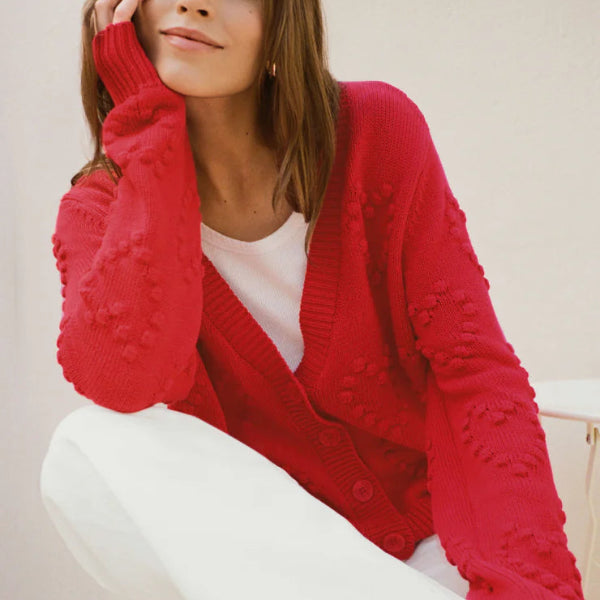 Made from breathable cotton yarn, this cardigan combines cozy texture with a relaxed fit that’s easy to layer. The dimensional heart-stitch detail adds a charming touch to a timeless silhouette you can dress up or down.