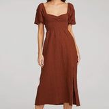 Our cotton Amara Midi Dress features a smocked upper body, sweetheart neckline and slit up the side.