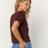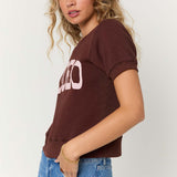 The Short Sleeve Shrunken Rodeo Sweatshirt is a perfect blend of cozy and cool. Made from our signature soft fleece, it features puff sleeves and a banded waist for just the right amount of shape. The eye-catching cacao color with distressed soft pink “rodeo” text adds a fun twist to your casual look. Pair it with your favorite jeans or joggers for a laid-back yet elevated outfit.
