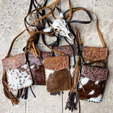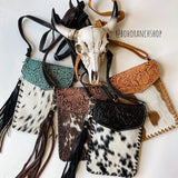 • hair-on cowhide on front • tooled leather flap • leather back • zippered pocket on back • magnetic closure • removable fringe keychain • adjustable leather strap • leather strap can be removed • leather color: brown, tan, turquoise and black