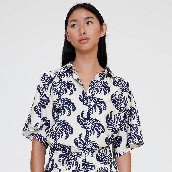 Shirt in crepe fabric with a palm spring print. Lapel collar and short sleeves. Button front closure.
