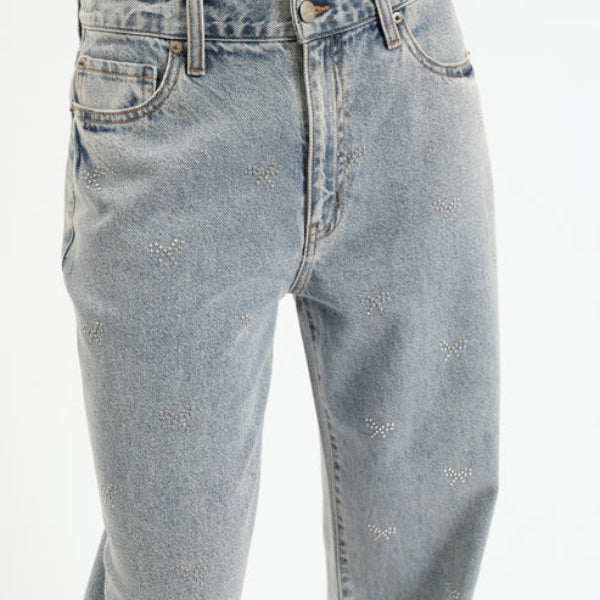 The 1999 in Lovers Knot is our signature slouch 90's fit jean featuring small bow embellishments. Wear this laid-back fit with a boot, sneaker, or flat — the options are endless. Constructed from our Rigid fabric, this pair has a true denim feel.
