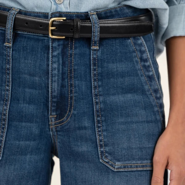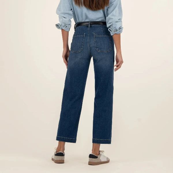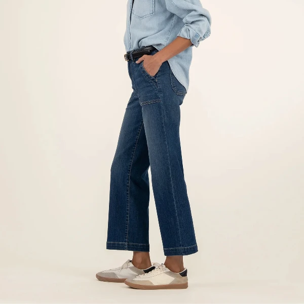 - Step up your denim game with these high-rise wide leg jeans in a flattering dark wash. Designed with porkchop pockets, a wide hem, and made from stretchy material, they offer both style and comfort. The structured silhouette and rich color make them a standout choice for any day of the week.
