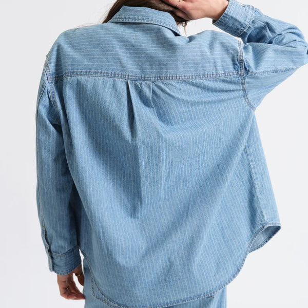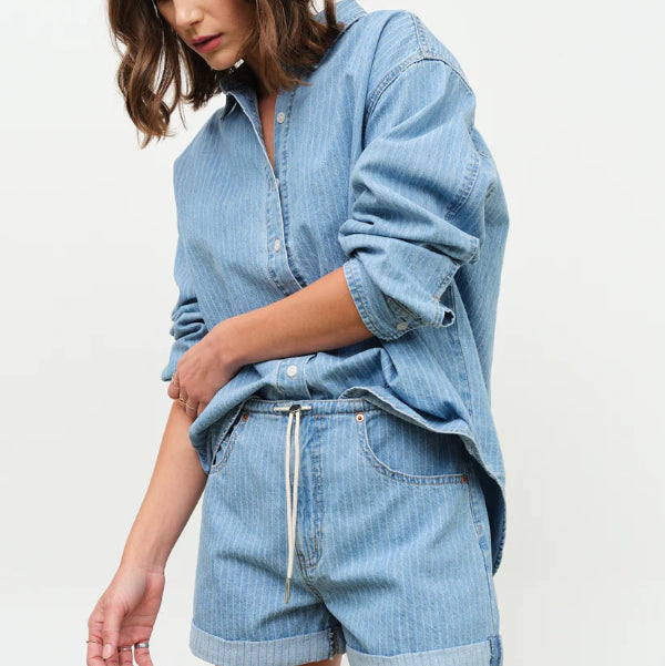 The Haven Long Sleeve Shirt in Whimsy is an easy oversized button-up designed for effortless layering. Featuring a soft light wash with subtle vertical striping, this relaxed silhouette pairs perfectly with the Maddie Short or Madison Wide Leg in Whimsy for an easy head-to-toe look.