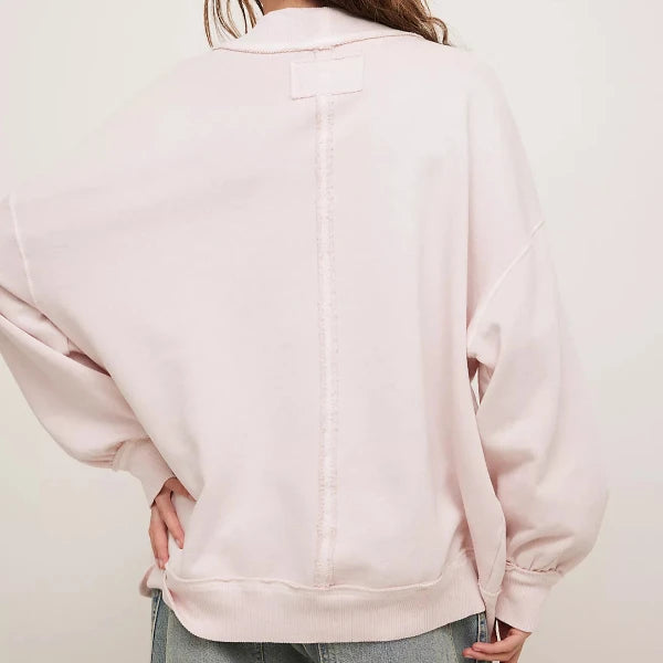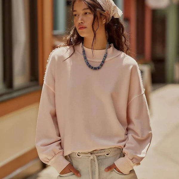 Features: French terry fabrication, mock neckline, drop-shoulder long sleeves, ribbed trim, exposed seams